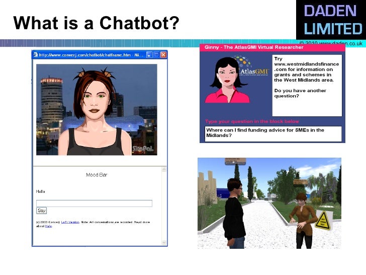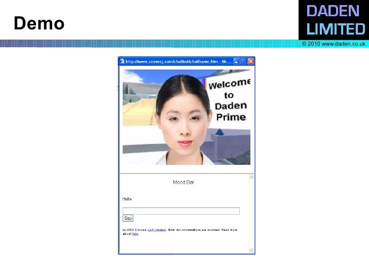 Deploying Chatbots to Customer Advantage A White Paper November 2010 www.daden.co.uk Abi is our own virtual receptionist. She is driven by our Discourse web sites like the BBC to give you news, Yahoo for weather, and even Wikipedia for general queries. She also exists in a variety of ... Fetch Full Source